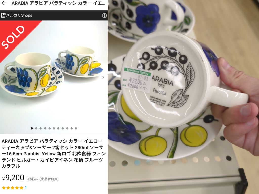リサーチのポイントは、装飾がちゃんとしてる果物系は北欧食器の定番デザイン。ARABIAという北欧食器の有名どころを覚えておけば間違いないですね。値付けの注意点は新旧ロゴ&カラー/モノクロで相場が変わる点だけ。