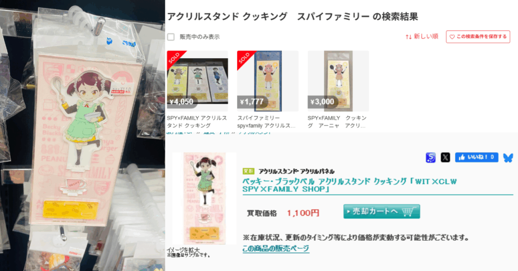→ 買取が残っている=底値ラインを確認できる。販売価格があれば上限も推定可能。 - マイナー作品の小物グッズ